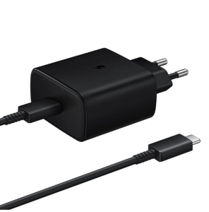 Thiết kế củ sạc “45 W PD Power Adapter” tương tự như bộ sạc 25 W mà Samsung sản xuất trước đó nhưng có kiểu dáng bầu bĩnh hơn, được gia công với chất liệu nhựa nhám hạn chế được dấu bám vân tay và mồ hôi. Các góc cạnh được thiết kế đều đặn, chắc chắn kết hợp là sắc đen huyền thoại, mang lại cho người dùng cảm giác sử dụng sạch sẽ, sang trọng.